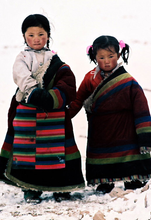 那是1989年歲末最后幾天,我隨藏北那曲地區(qū)(現(xiàn)那曲市)基層政權(quán)建設(shè)工作現(xiàn)場會“訪問團”來到文部辦事處(現(xiàn)尼瑪縣)參觀。來到卓瓦鄉(xiāng)時,我眼前突然一亮:在雪地上玩耍的草原小姐妹,三五歲的樣子,身著五彩羔皮藏袍,扎著羊角小辮,臉頰上印刻著深紫色“高原紅”。那是草原上一道最美麗的風景線,我不由得按動手中相機快門……