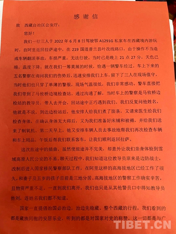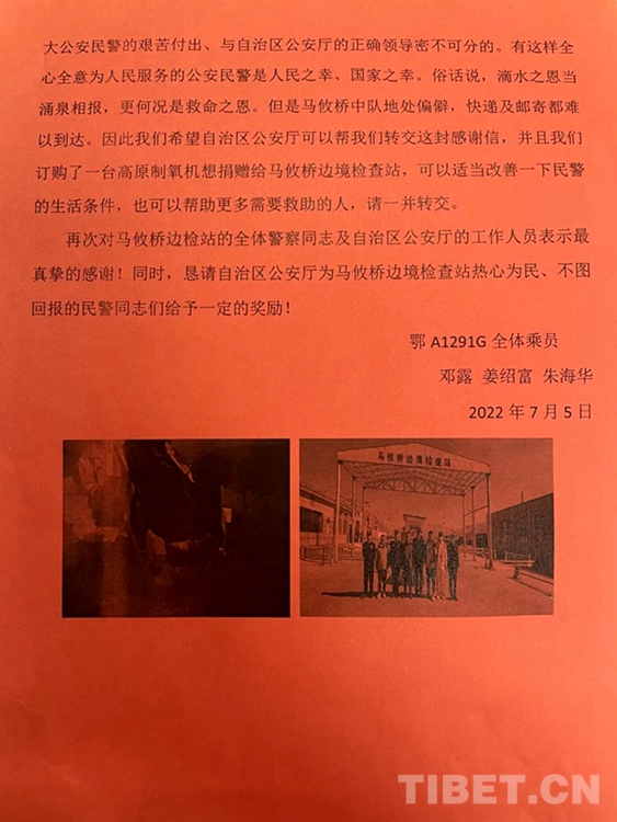 中國西藏網(wǎng)訊 近日,西藏自治區(qū)阿里邊境管理支隊馬攸橋邊境檢查站(以下簡稱:馬攸橋邊境檢查站)收到了一份署名為“鄂A1291G全體乘員”的包裹,里面包含了一面錦旗,一封感謝信,還有一份特別的禮物。