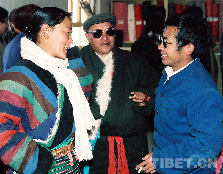 這是文部辦事處主任加央多吉(右)與參加那曲地區(qū)基層政權(quán)建設(shè)工作現(xiàn)場會(huì)的那曲縣縣長嘎瑪(左)在交流(唐召明1989年12月份攝)
