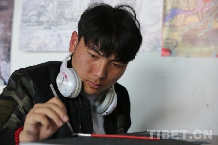 同期學(xué)員中,同樣來(lái)自唐卡世家的白瑪旺青,肩負(fù)家族厚望,被父親委派而來(lái)。2019年,白瑪旺青的父親學(xué)到半途,家中突然接到《格薩爾王與三十大將》的唐卡長(zhǎng)卷訂單,不得不退學(xué)回到江達(dá)縣家中主持繪制工程。這次,他把兒子白瑪旺青、學(xué)徒桑培和尼瑪布派來(lái)學(xué)習(xí),自己帶著46個(gè)學(xué)徒繼續(xù)完成訂制唐卡的繪制。“父親對(duì)唐卡漆畫很支持,要求我們認(rèn)真學(xué),學(xué)成后再傳授給他本人和更多的學(xué)徒,”白瑪旺青說(shuō),“我和父親覺(jué)得,創(chuàng)作漆畫比傳統(tǒng)唐卡快,也會(huì)贏得新的市場(chǎng),能帶動(dòng)更多學(xué)徒增收。”