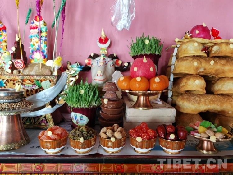 圖為藏歷新年期間擺放的切瑪盒等,其中盛放各類干果的酥油茶碗由中央代表團(tuán)贈(zèng)送 攝影:歐帆
