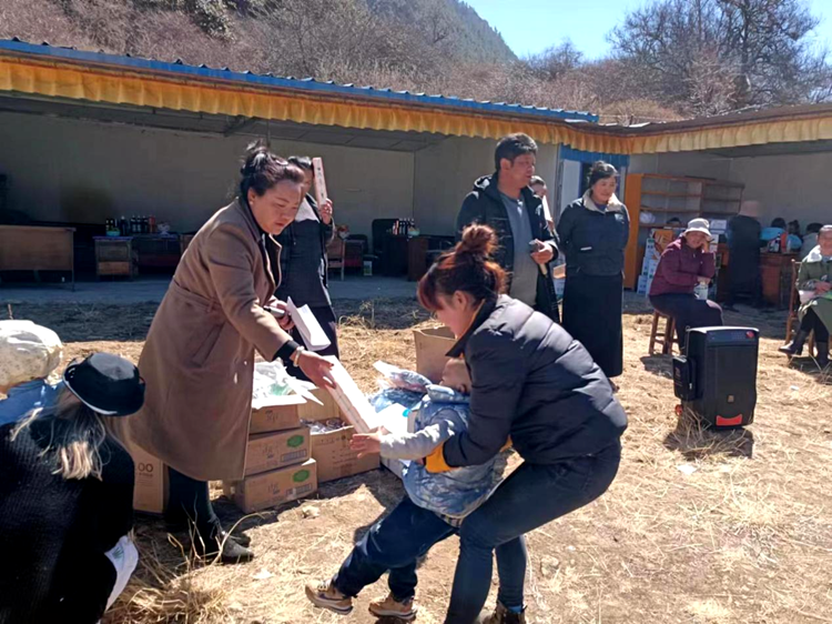 圖為亞夏(右三)在豐收節(jié)上為大家發(fā)放文體趣味活動紀(jì)念品