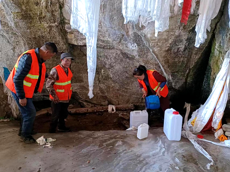圖為亞夏帶領(lǐng)村護(hù)林員深入扎貢溝收集水源