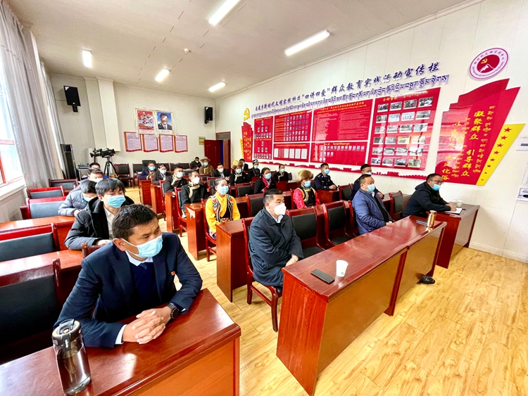 圖為山南市隆子縣玉麥鄉(xiāng)干部集中收聽(tīng)收看黨的二十大開(kāi)幕盛況