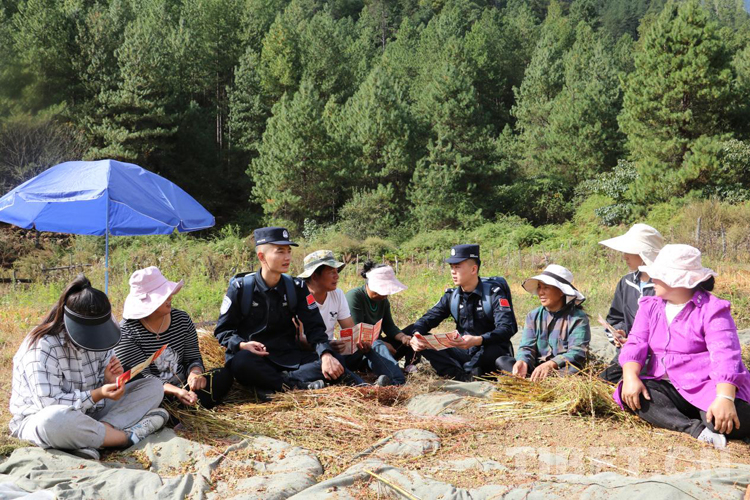 在田間地頭,趁著村民正坐在田坎上休息,“背包民警”向大家介紹:“習(xí)近平總書記在二十大報告中提出,增進(jìn)民生福祉,提高人民生活品質(zhì)……”“背包民警”邊宣講邊向村民們發(fā)放了自己印發(fā)的黨的二十大精神宣講手冊,據(jù)了解,考慮到轄區(qū)群眾以中老年人為主,大多數(shù)認(rèn)識漢字不多,所以“二十大精神宣講手冊”采取圖文并茂的方式,用最通俗易懂的話向群眾解釋二十大報告的內(nèi)容。