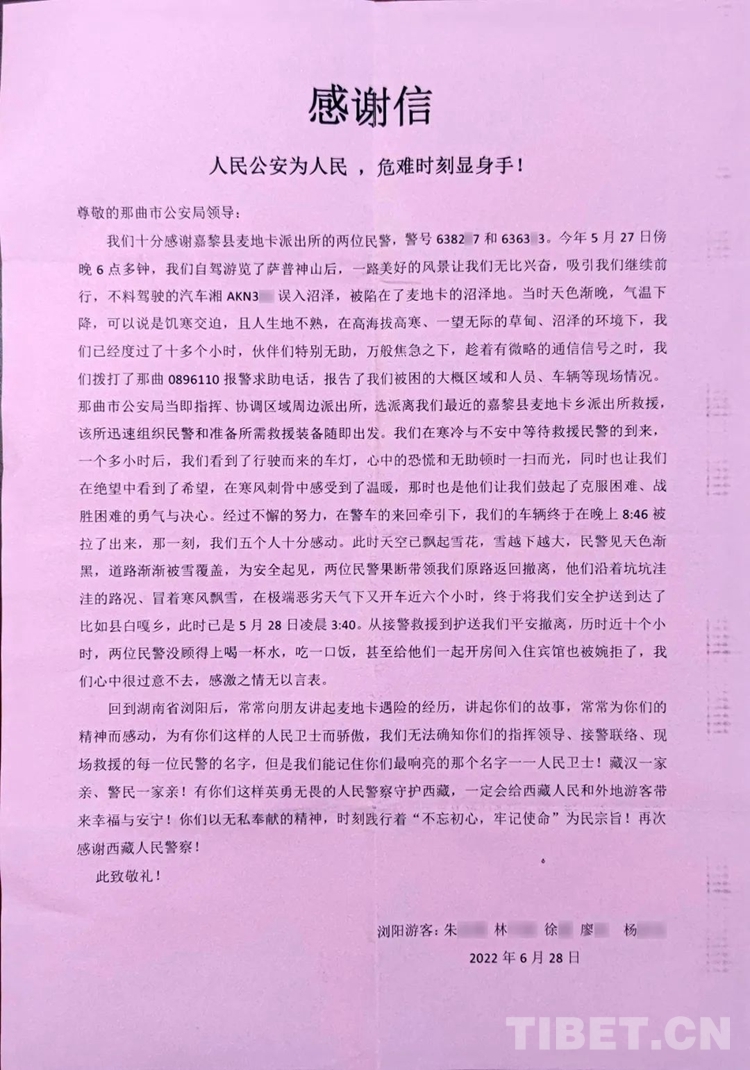 近日,那曲市公安局收到了一份特別的禮物,這是一面印著“人民公安為人民、危難時(shí)刻顯身手”的錦旗和一封飽含深情的感謝信。這份特別的禮物是湖南市民朱先生、徐先生寄到西藏的,以此表達(dá)對(duì)那曲市公安局、那曲市嘉黎縣公安局麥地卡鄉(xiāng)派出所民警的感激之情。
