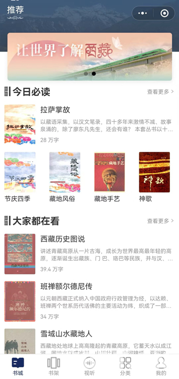 “掌讀西藏”為讀書公益類平臺,免費向讀者提供中國西藏主題的電子圖書。目前有《古格王國》《神歌》《達賴?yán)镛D(zhuǎn)世制度》《班禪額爾德尼傳》《拉薩掌故》《雪域山水藏地人》《節(jié)慶四季》《西藏歷史圖說》《進軍西藏日記》等29本電子圖書。這些電子圖書都是作者寶貴的知識結(jié)晶,也是對中國西藏珍貴的歷史記憶,濃縮了幾代人見證中國西藏發(fā)展的時代烙印。