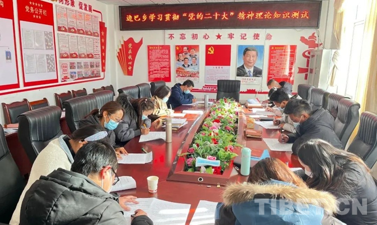 圖為洛扎縣邊巴鄉(xiāng)黨委理論學(xué)習(xí)中心組學(xué)習(xí)貫徹黨的二十大精神并進(jìn)行黨的二十大精神理論知識(shí)測(cè)試。(中國(guó)西藏網(wǎng) 記者/賈華加 圖片來源:洛扎縣宣傳部)
