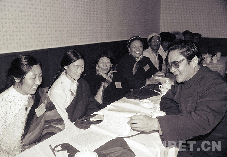 這是時(shí)任西藏自治區(qū)黨委副書記熱地(右)在與人大代表進(jìn)行交流。1988年1月15日至23日,西藏自治區(qū)第四屆人民代表大會(huì)第六次會(huì)議在拉薩召開(唐召明1988年攝)