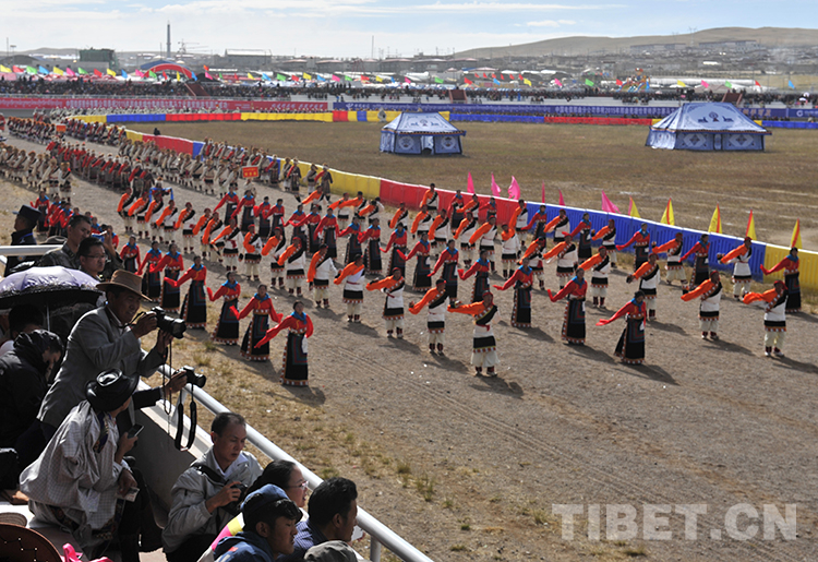 這是來自那曲地區(qū)(現(xiàn)那曲市)各縣代表隊在進行入場式表演。當日,那曲賽馬藝術節(jié)在藏北首府那曲鎮(zhèn)開幕(唐召明2013年8月10日攝)