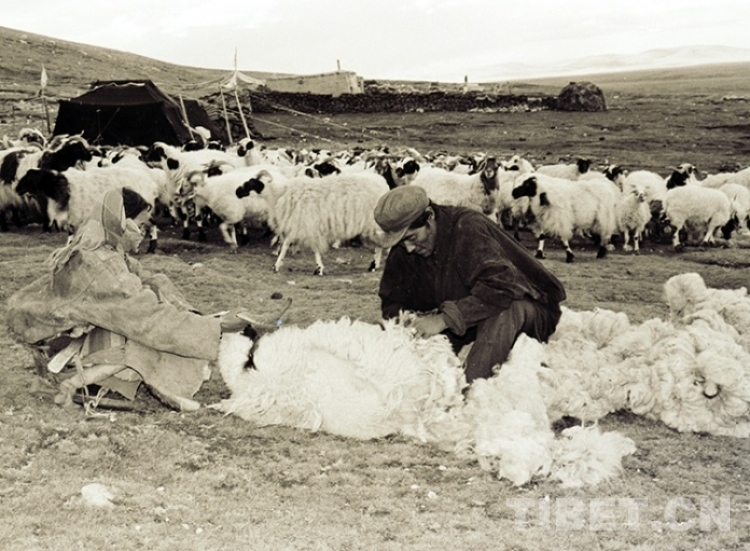 這是班戈縣一戶牧民人家正在草原上剪羊毛(唐召明1988年攝)