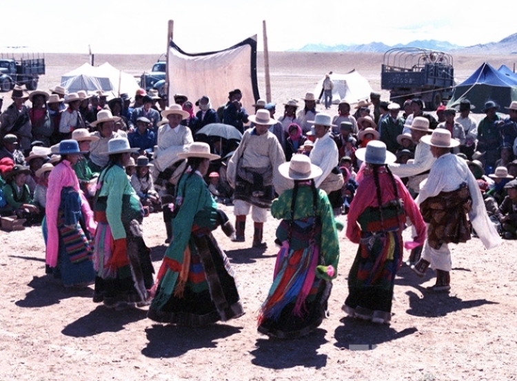 這是文部辦事處(現(xiàn)尼瑪縣)賽馬會上,牧民群眾在跳“鍋莊”舞(唐召明1987年攝)