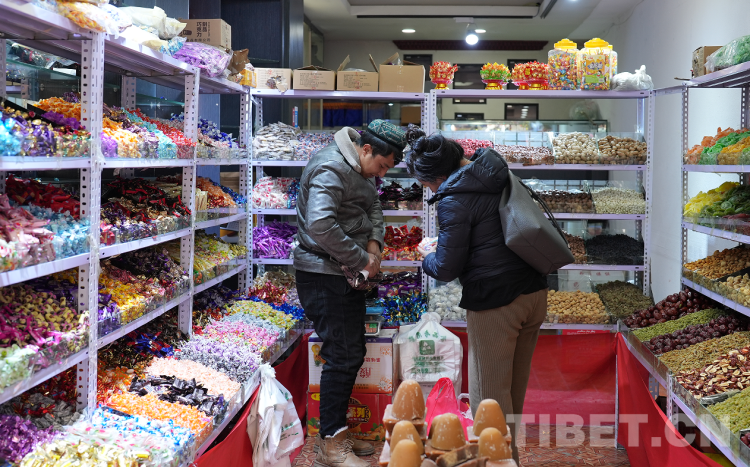 在八廓商城附近的一家門店里,來自新疆當(dāng)?shù)氐暮吞锎髼?、天山沙棗、葉城核桃、大白杏干、馬奶子葡萄干、天山烏梅、巴旦木等,因食材地道、品質(zhì)優(yōu)良格外受到拉薩市民的青睞。老板是位“00”后維吾爾族青年,頭腦靈活,待人熱情,近日來持續(xù)火爆的生意更是讓他高興得合不攏嘴。上門購物的顧客有藏族、漢族、回族等民族,他們除了購買地道的新疆干果,還會購買該店專為藏歷新年新上的大白兔奶糖、彩色硬質(zhì)水果糖、果汁軟糖、巧克力、棒棒糖、藏式奶渣等貨品。人們用漢語加手勢比劃著交流,溝通無礙,再加上移動支付方便快捷,老板誠信經(jīng)營,顧客們總能高興而來,滿意而歸。