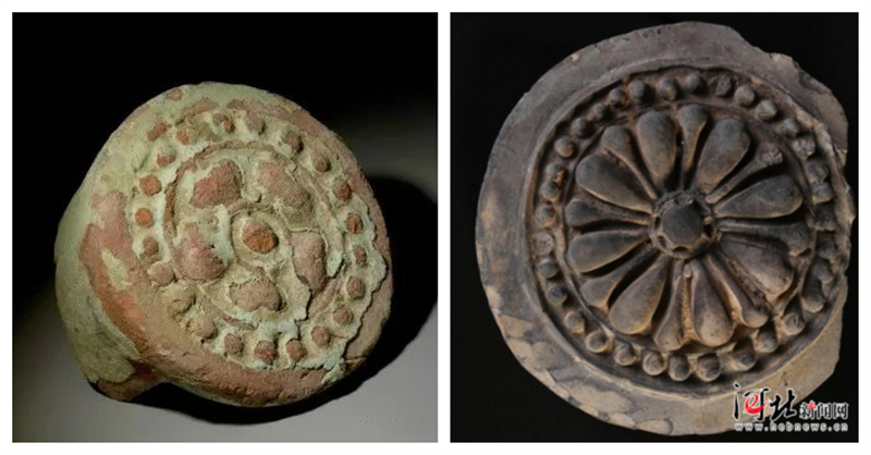 圖為西藏曲水溫江多遺址出土的綠釉紅陶帶筒瓦蓮花瓦當(dāng)(左圖片來源:國(guó)家文物局)與河北正定開元寺附近出土的唐代蓮花紋瓦當(dāng)(圖右圖片來源:燕趙都市報(bào))紋樣對(duì)比