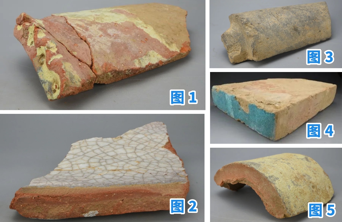 圖為西藏曲水溫江多遺址出土的各種建筑材料,圖1為綠釉紅陶花口板瓦殘塊、圖2為白釉紅陶板瓦殘塊、圖3為帶刻痕帶瓦舌灰陶筒瓦殘塊、圖4為藍(lán)釉琉璃磚、圖5為綠釉紅陶筒瓦殘塊 圖片來源:國(guó)家文物局供圖拼合