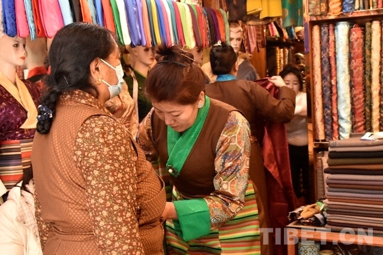 近日,記者走進(jìn)位于拉薩北京東路的一家藏裝店,各類布料琳瑯滿目、顏色絢麗,花紋更是多種多樣,選擇性很多。店內(nèi)顧客絡(luò)繹不絕,有的試穿藏裝,有的挑選布料,老板曲宗和店員為顧客選布料、量尺寸、介紹款式,忙得不可開交。