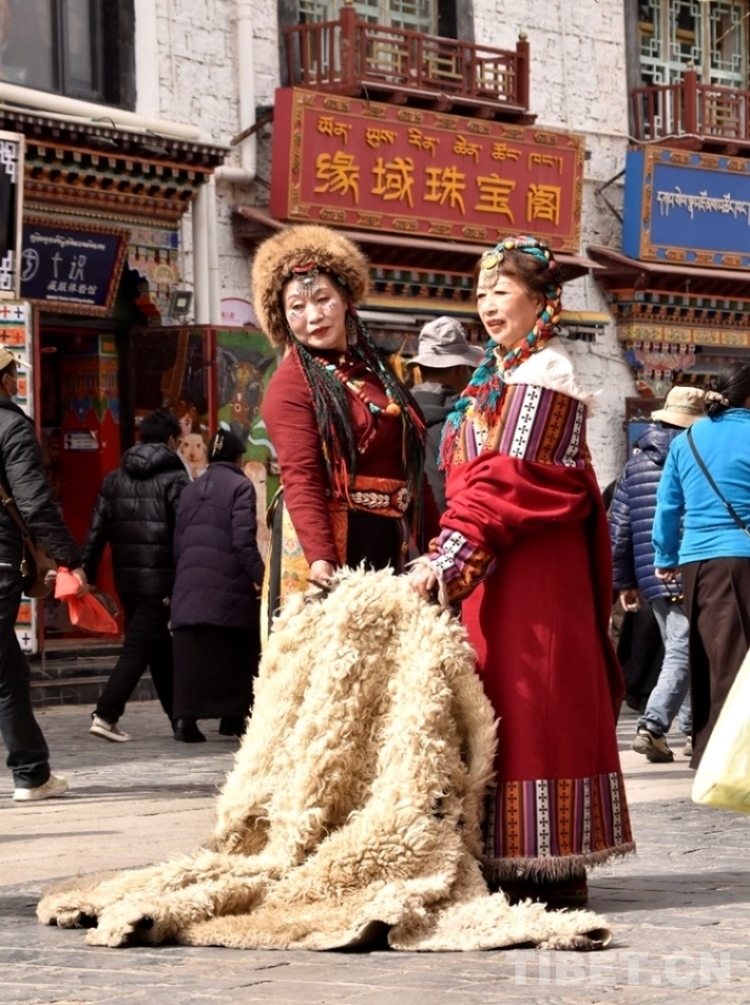 圖為3月15日,游客身著藏族傳統(tǒng)服飾在拉薩八廓街拍照留念 攝影:次旦拉姆