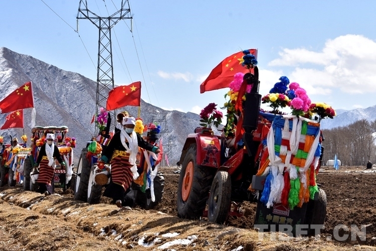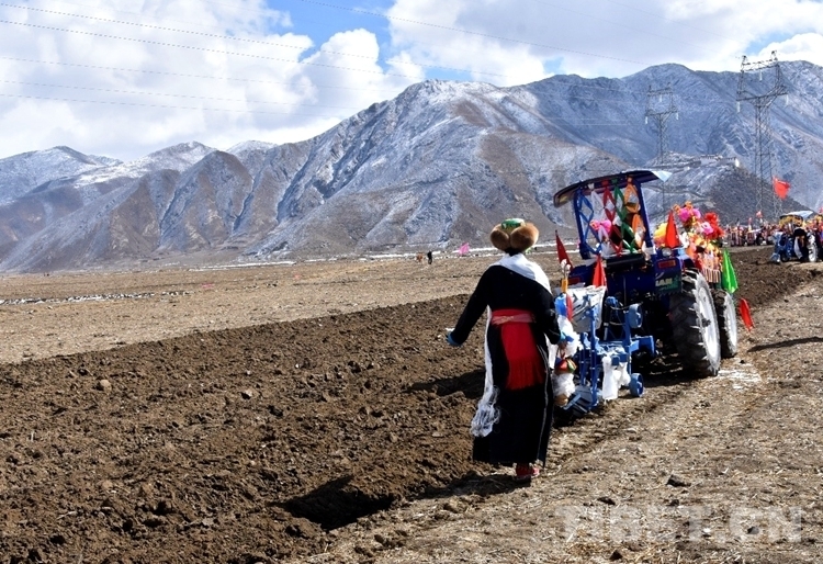 在雪水浸潤(rùn)過(guò)的肥沃土地上,深耕機(jī)車(chē)輪翻滾而過(guò),駛過(guò)的土地上翻起深色的泥土,婦女們跟在后面播撒青稞良種。