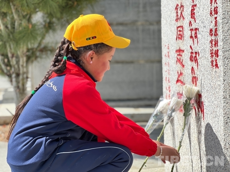圖為西藏日喀則市昂仁縣多白鄉(xiāng)小學生為革命先烈敬獻鮮花 攝影:德吉卓瑪