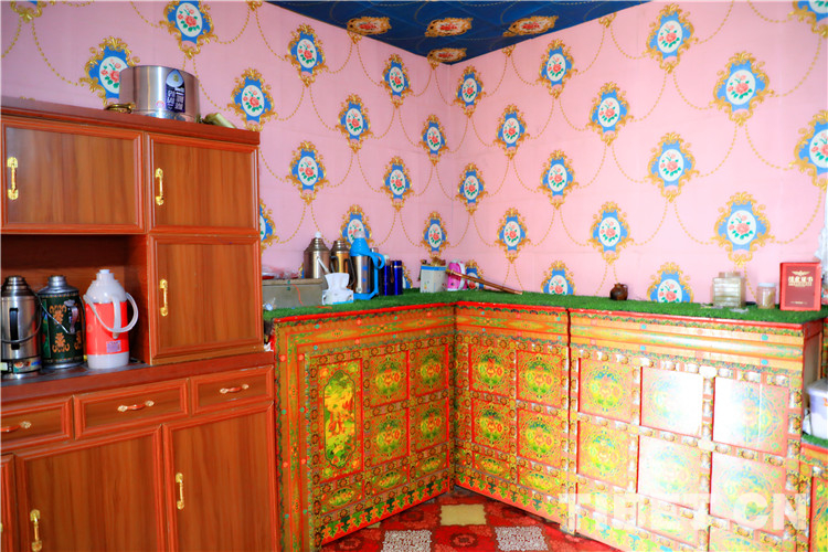 旦增卓措不僅希望自己的村子干干凈凈的,還將自家房屋安排得整潔舒適。她的房屋不大,但是都是自己親自裝扮。不大的客廳,從天花板到地面,都裝飾成自己喜歡的顏色,粉紅色的墻紙將女生的小浪漫展現(xiàn)無遺;沙發(fā)的靠背和窗簾的帷幕都是精致的流蘇或蕾絲;藏式家具擦拭得干干凈凈,水壺、熱水器、水杯、紙巾都擺放得整整齊齊……一眼望去,誰不夸贊一句“精致girl”。