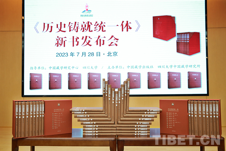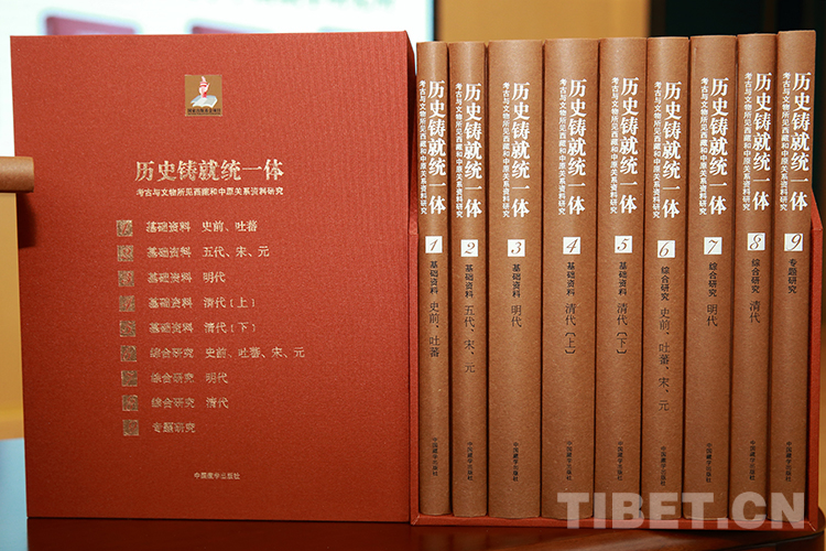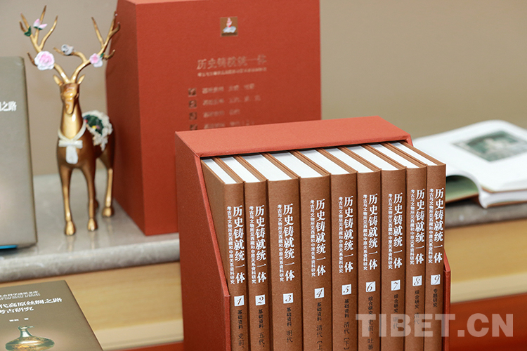 圖為發(fā)布會現場展覽的《歷史鑄就統(tǒng)一體:考古與文物所見西藏和中原關系資料研究》全套圖書 攝影:陳衛(wèi)國