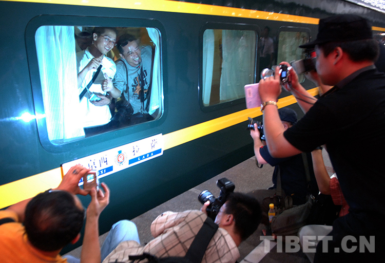 青藏鐵路開(kāi)通運(yùn)營(yíng),北京至拉薩的首趟列車(chē)在北京西站發(fā)車(chē)。這是發(fā)車(chē)前,車(chē)上旅客在車(chē)窗前向外展示手中車(chē)票,人們紛紛拍照留念(唐召明2006年7月1日攝)