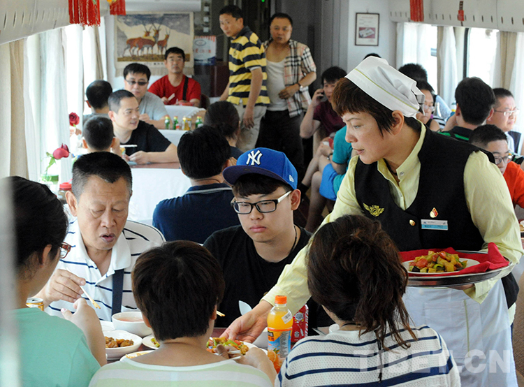 北京鐵路局北京客運(yùn)段京藏車(chē)隊(duì)副隊(duì)長(zhǎng)彭海燕在北京開(kāi)往拉薩的餐車(chē)上為就餐旅客服務(wù)(唐召明2014年7月5日攝)