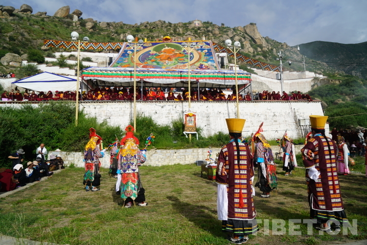 在巨幅唐卡下,精彩的藏戲正在上演,這是雪頓節(jié)必不可少的傳統(tǒng)項(xiàng)目之一。在17世紀(jì)以前,雪頓節(jié)是純粹的宗教節(jié)日。在青藏高原,每年夏季天氣漸暖,百蟲驚蟄而出土活動。為了避免傷害生靈而違背了佛祖釋迦牟尼不殺生的戒律,藏傳佛教格魯派規(guī)定每年藏歷四至六月,不準(zhǔn)僧人出寺活動,要在寺院安居靜修三個月,直到六月底解夏后才能出寺。而每當(dāng)?shù)竭@個時候,當(dāng)?shù)氐钠矫癜傩斩家〕鏊崮滔蛩略豪锏纳斯┓?。同時在拉薩哲蚌寺舉行歡慶節(jié),演出藏戲。每年雪頓節(jié)期間,羅布林卡的藏戲最為有名,當(dāng)?shù)厝罕娫谀抢锟床貞颉⑦^林卡已成為傳統(tǒng)。在今年雪頓節(jié)期間,宗角祿康公園也正在表演藏戲,來自眾多地市的藏戲團(tuán)輪番上演,極大豐富了市民和游客的文化生活,成為保護(hù)和了解藏族文化的一個窗口。