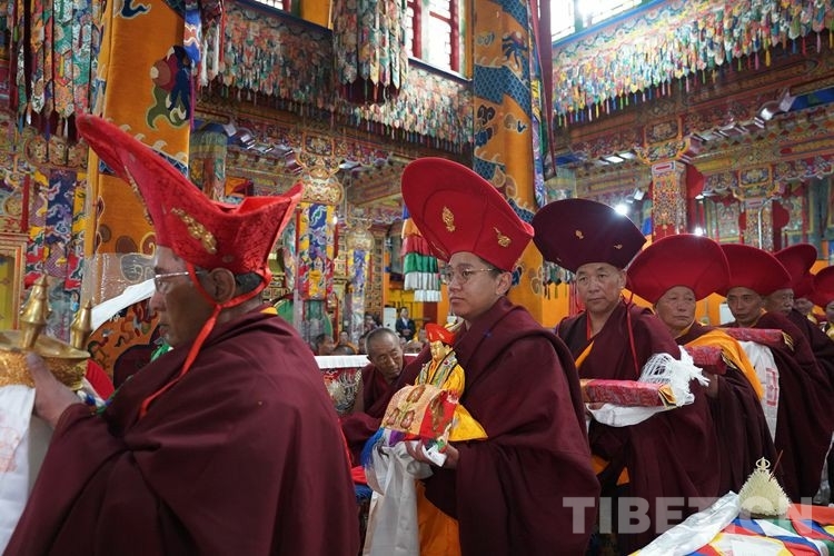當日11時許,在眾僧的期盼中,班禪一行抵達直孔替寺。頓時,現(xiàn)場法號齊鳴、法螺合奏,直孔瓊倉·洛桑強巴活佛和僧眾在寺廟前舉行了隆重的歡迎儀式。
