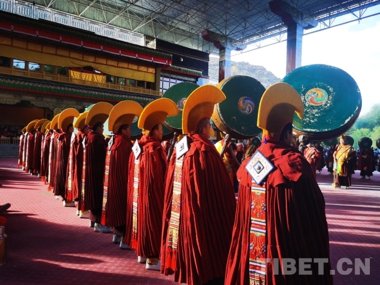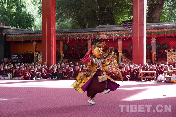 中國西藏網訊 9月19日,扎什倫布寺舉行的為期三天的“羌姆”表演落下帷幕?!扒寄贰笔怯缮畟H表演的一種宗教舞蹈,也稱跳神。