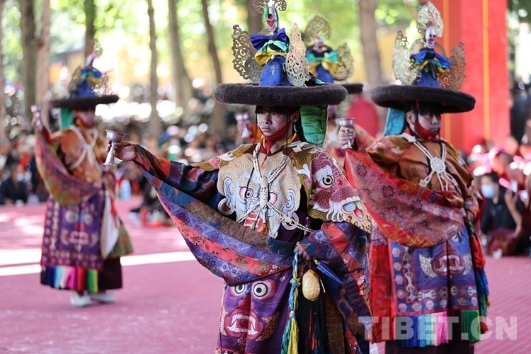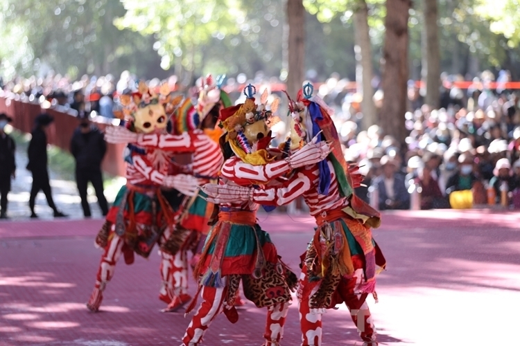 當渾厚悠遠的法號、法螺聲在大院內外回旋開來,“羌姆”表演正式拉開帷幕。期間,僧人頭戴面具,身穿戲裝,手持鼓刀斧等道具,逐次表演金剛、骷髏、鹿牛、比丘、鴉鴟、六長壽等數十節(jié)神舞,氣氛莊重而神秘。