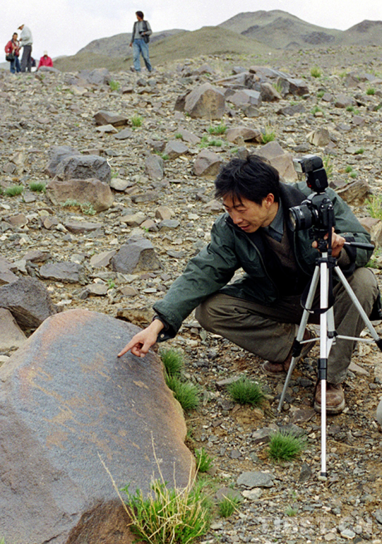 藏北高原無人區(qū)科考團(tuán)人員在對尼瑪縣榮瑪鄉(xiāng)加林山巖畫進(jìn)行科考(唐召明2001年攝)