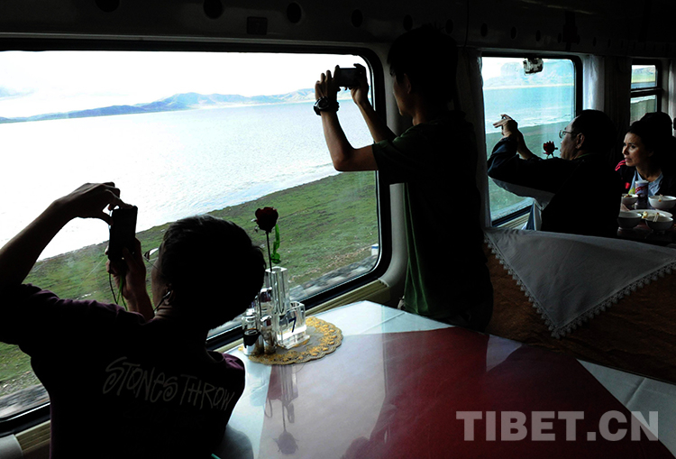 “天路”列車在通過錯那湖時,旅客們紛紛用手機拍攝美景(唐召明2012年8月12日攝)