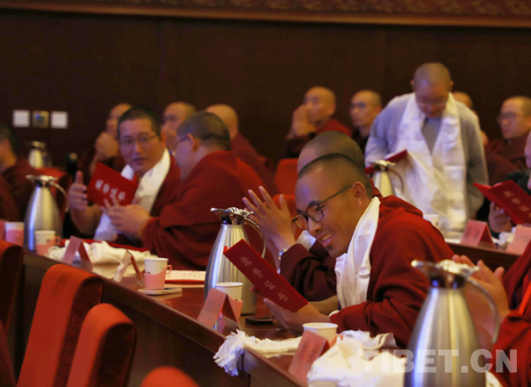中國藏語系高級佛學(xué)院副院長土多申格主持閉幕會主旨發(fā)言,副院長郭莽倉宣布教義闡釋論文獲獎人員名單,與會領(lǐng)導(dǎo)向獲獎?wù)撐淖髡哳C發(fā)證書。