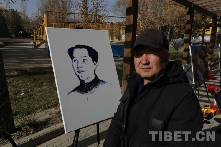來到作畫區(qū)域,首先吸引記者注意的便是身穿黑衣、頭戴灰帽的西爾艾力·艾買提老人。在雪白的畫布前,老人用藍色和墨色顏料深淺描繪,勾勒出我們最熟悉的面孔。他向我們介紹說:“我畫的是我們偉大的毛主席年輕時候。沒有毛主席,我們中國人的生活不是這個樣子的,我很感恩他。我畫毛主席就是想讓更多人看見,讓他的故事得到更好的緬懷。”