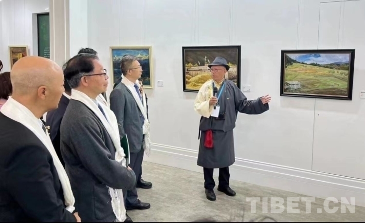 圖為現(xiàn)場嘉賓參觀西藏油畫作品現(xiàn)場