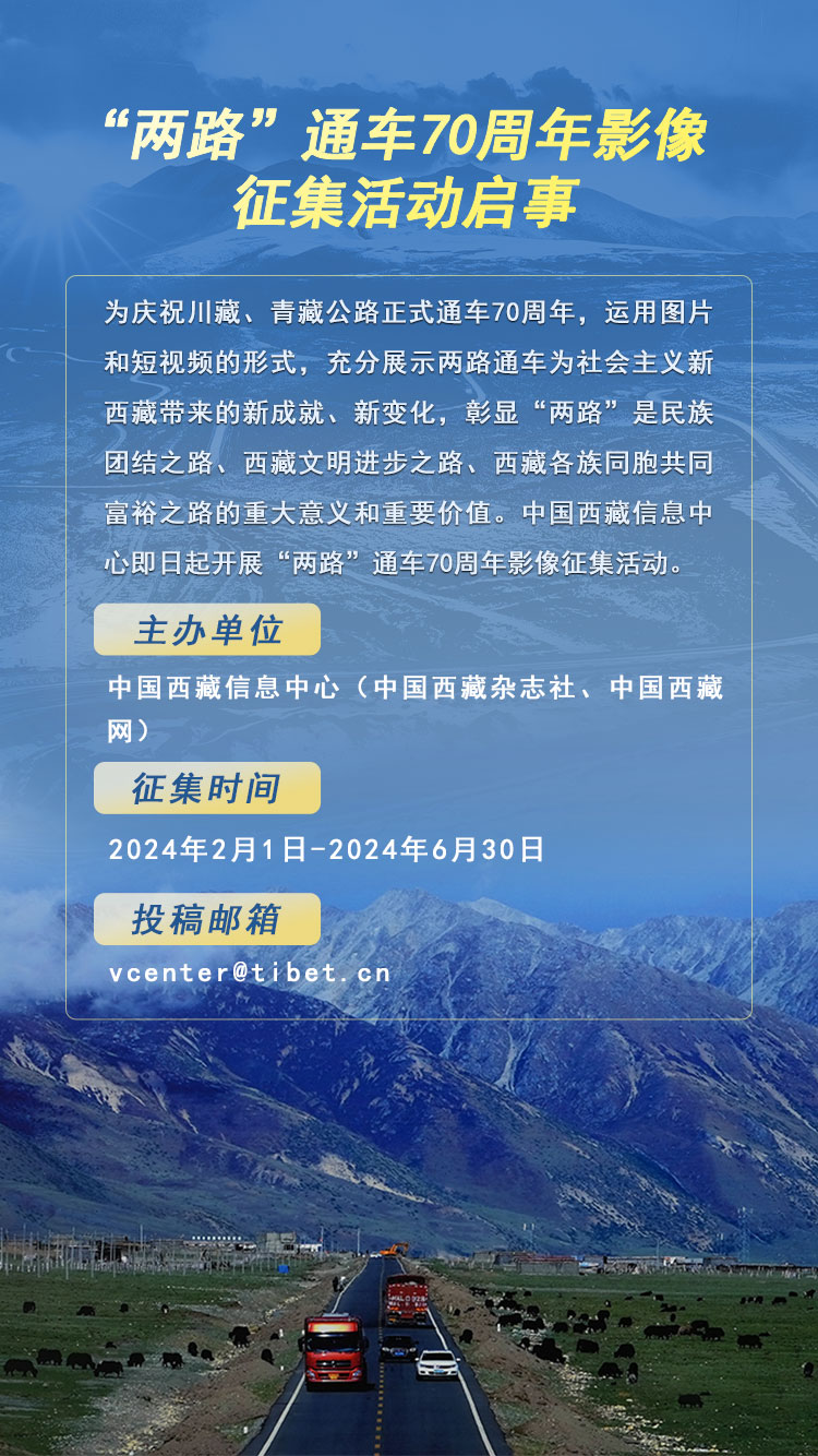 為慶祝川藏、青藏公路正式通車70周年,運(yùn)用圖片和短視頻的形式,充分展示兩路通車為社會(huì)主義新西藏帶來(lái)的新成就、新變化,彰顯“兩路”是民族團(tuán)結(jié)之路、西藏文明進(jìn)步之路、西藏各族同胞共同富裕之路的重大意義和重要價(jià)值。中國(guó)西藏信息中心即日起開展“兩路”通車70周年影像征集活動(dòng)。