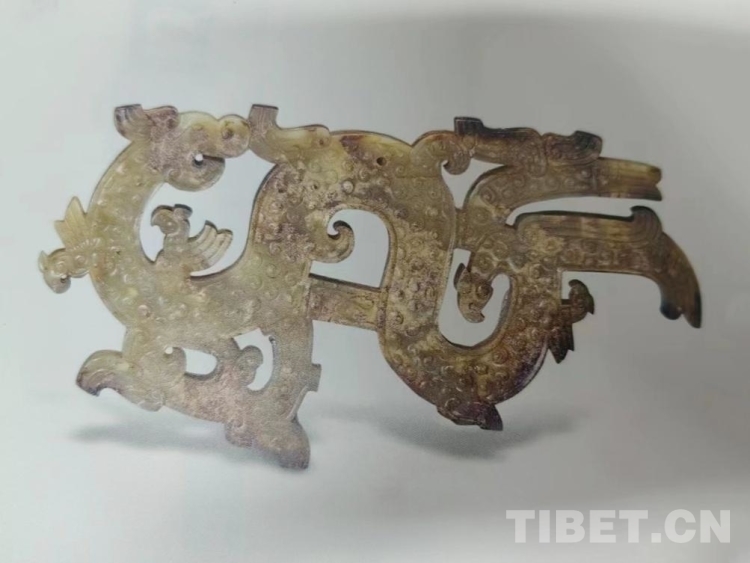 最精妙的是,玉佩整體呈片狀,兩面鏤雕相同紋飾。龍張口回首,龍身滿飾谷紋,尾上雕一大鳥,龍頭內外側及尾部又各凸雕一小鳥,于龍身中部有一圓形鉆孔。此種龍鳳佩是戰(zhàn)國時期特有的造型,手法夸張,圖紋精美,線條卷曲相連,體現了制作者豐富的想象力。(中國西藏網 綜合/周晶 攝影/楊月云)