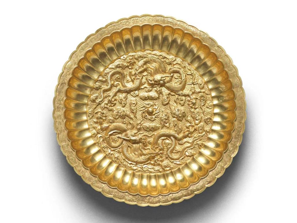 圖為公元18世紀(jì)雙龍戲珠菊瓣金盤(pán)