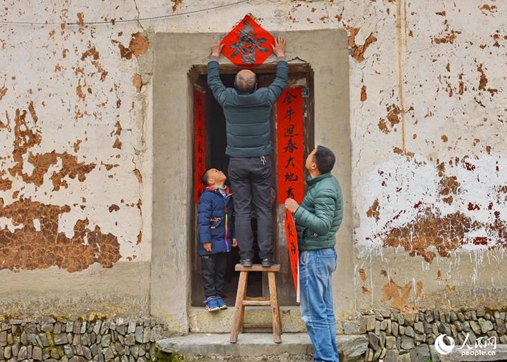 圖為貼春聯(lián)迎新年 攝影:吳靈萱 來源:人民網(wǎng)