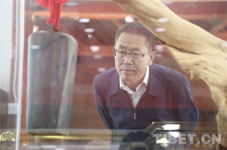 圖為莫河駝場青藏駝隊(duì)歷史陳列館館長張存虎觀看西藏運(yùn)輸總隊(duì)頭駱駝鈴 攝影:王茜