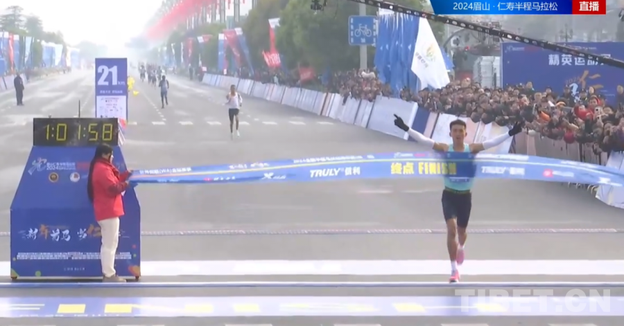 圖為2024仁壽半程馬拉來自西藏自治區(qū)運(yùn)動(dòng)員扎西次仁奪冠并打破全國半馬記錄