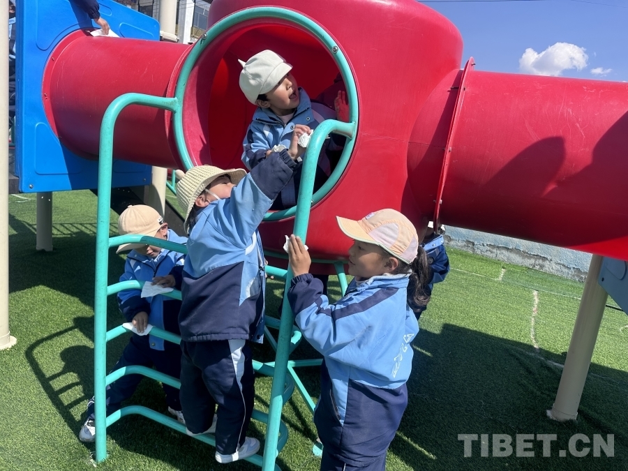 圖為拉孜縣幼兒園孩子們積極參與校園衛(wèi)生大掃除