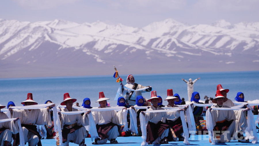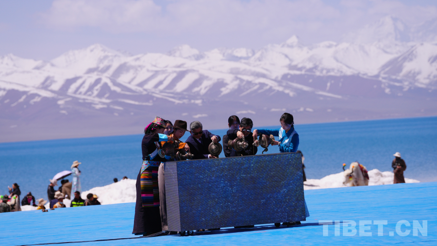 念青唐古拉山脈皚皚雪山高聳入云,清澈碧藍(lán)的納木錯(cuò)湖水一望無(wú)際,牧民牽著白牦牛在湖邊悠閑地散步,成群的棕頭鷗發(fā)出歡快的叫聲在空中自由飛翔……在令人如癡如醉的絕美景色為背景的祈福儀式上,身著盛裝的300名演員結(jié)合當(dāng)?shù)孛袼孜幕?,手捧哈達(dá)、牛角、烏爾朵(拋石器)等呈現(xiàn)盛大的祈福儀式,給現(xiàn)場(chǎng)觀眾帶來(lái)一場(chǎng)羌塘高原別具一格的視覺(jué)盛宴。