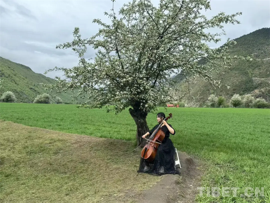 悠揚(yáng)的樂聲自林間傳來,沿著步道往深處走去,一場特別的演奏會(huì)正在進(jìn)行。枝頭海棠盛放,樹下游人如織,鋼琴、大提琴、笛子等各色樂器奏出的曲調(diào)在貢嘎海棠的映襯下更顯別樣風(fēng)味,來自西安的韓先生細(xì)細(xì)聆聽木雅傳統(tǒng)非遺口弦的演奏后不禁感嘆道,“太美了!這個(gè)活動(dòng)將音樂與貢嘎海棠花海巧妙融合,讓我感受到一種別樣的人與自然共生的和諧。”