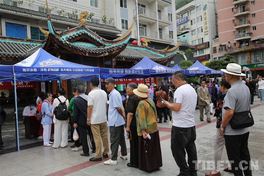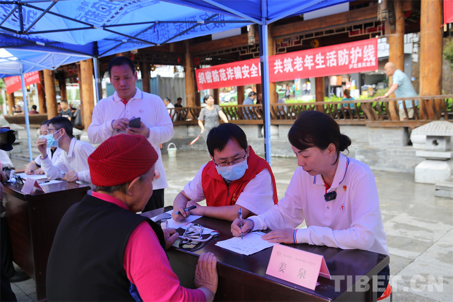 圖為瀘定橋廣場(chǎng)義診點(diǎn),專(zhuān)家正在為患者量血壓 攝影:登真巴珍