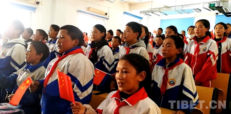 圖為四川省甘孜州石渠縣第二完全小學(xué)學(xué)生代表與醫(yī)療專家們一起高唱國歌 攝影:劉莉