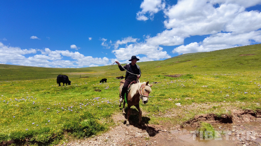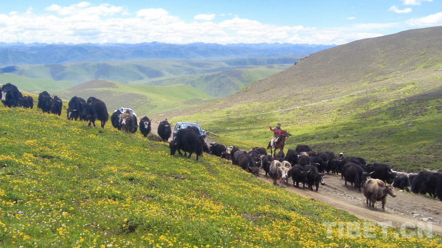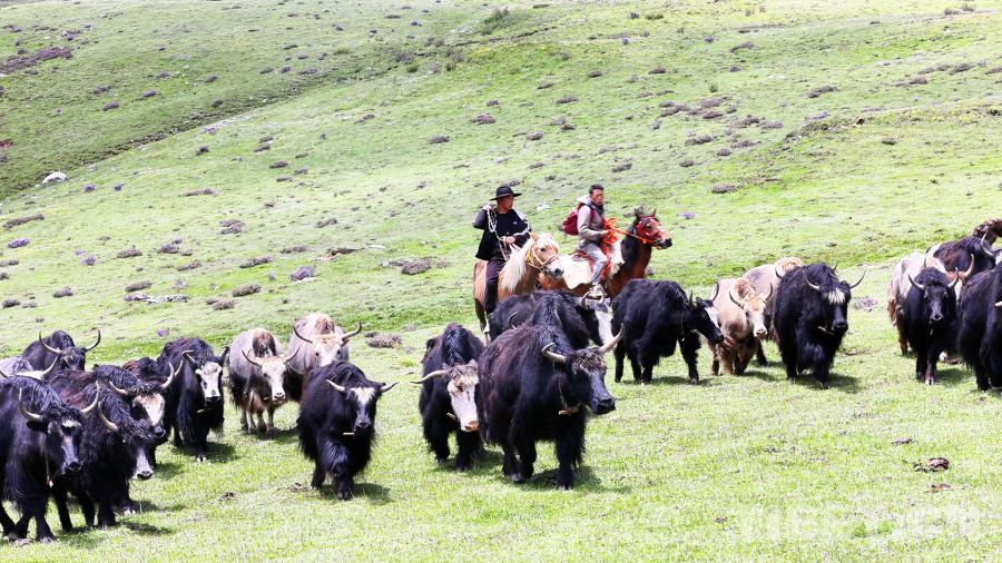 昌臺(tái)草原的7月,進(jìn)入夏季,白玉縣阿察鎮(zhèn)阿察村的牧民們便開(kāi)始轉(zhuǎn)移牧場(chǎng),從冬季牧場(chǎng)日通草原轉(zhuǎn)移到夏季牧場(chǎng)石門科草原,每一次轉(zhuǎn)場(chǎng)都是一次大遷徙,氣勢(shì)磅礴壯觀。四郎彭措一家也開(kāi)始了今年的轉(zhuǎn)場(chǎng)工作,沿著冬季牧場(chǎng)到夏季牧場(chǎng)的牧道,四郎彭措和表弟仁真巴登兩位牧人騎著兩匹駿馬,趕著一群牦牛有序地進(jìn)行著轉(zhuǎn)場(chǎng)。