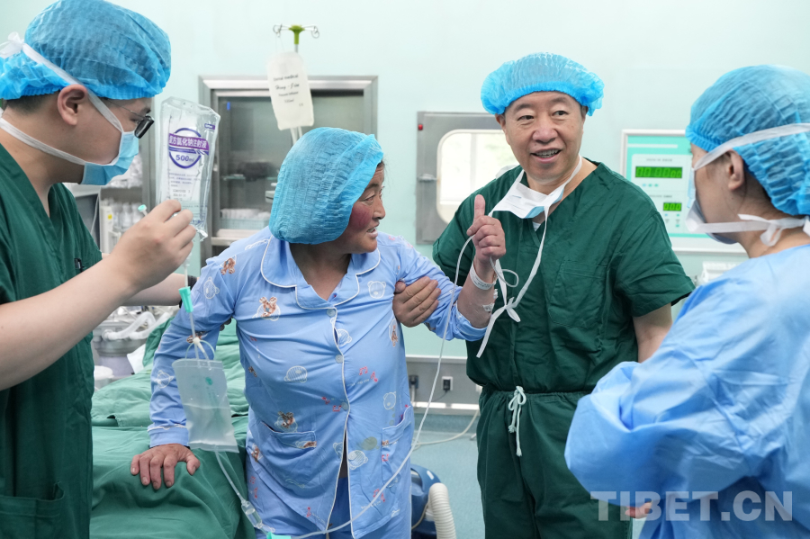 圖為手術(shù)室內(nèi),剛剛完成局部麻醉微創(chuàng)椎管擴(kuò)大減壓手術(shù)的藏族患者穆女士在張西峰(左三)的指導(dǎo)下成功站立,并為張教授的精湛醫(yī)術(shù)點(diǎn)贊。