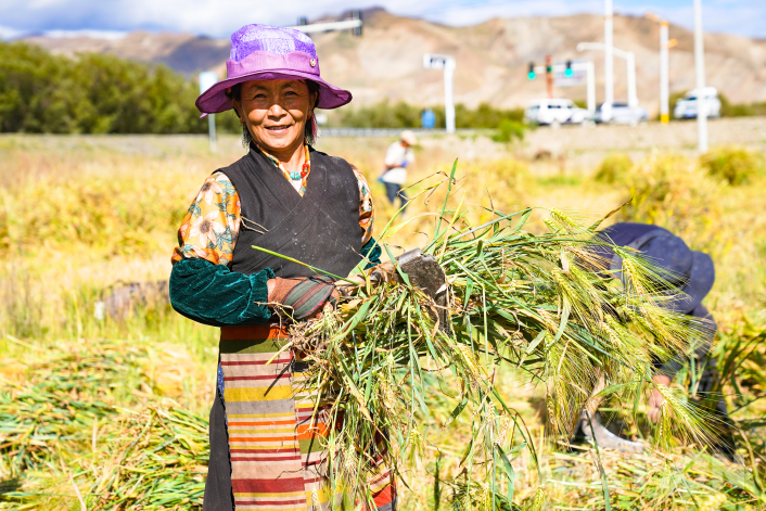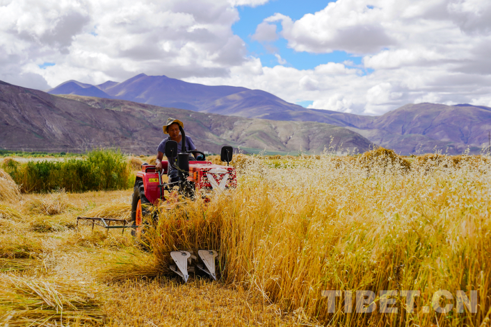 飄香的秋日一片金黃,一臺(tái)臺(tái)收割機(jī)正在青稞田里往來(lái)穿梭。2023年,西藏青稞產(chǎn)量達(dá)84.36萬(wàn)噸,播種面積達(dá)222.87萬(wàn)畝,累計(jì)建成高標(biāo)準(zhǔn)農(nóng)田430萬(wàn)畝,青稞良種覆蓋率達(dá)到93%,主要糧食作物耕種收綜合機(jī)械化率達(dá)到71%以上。